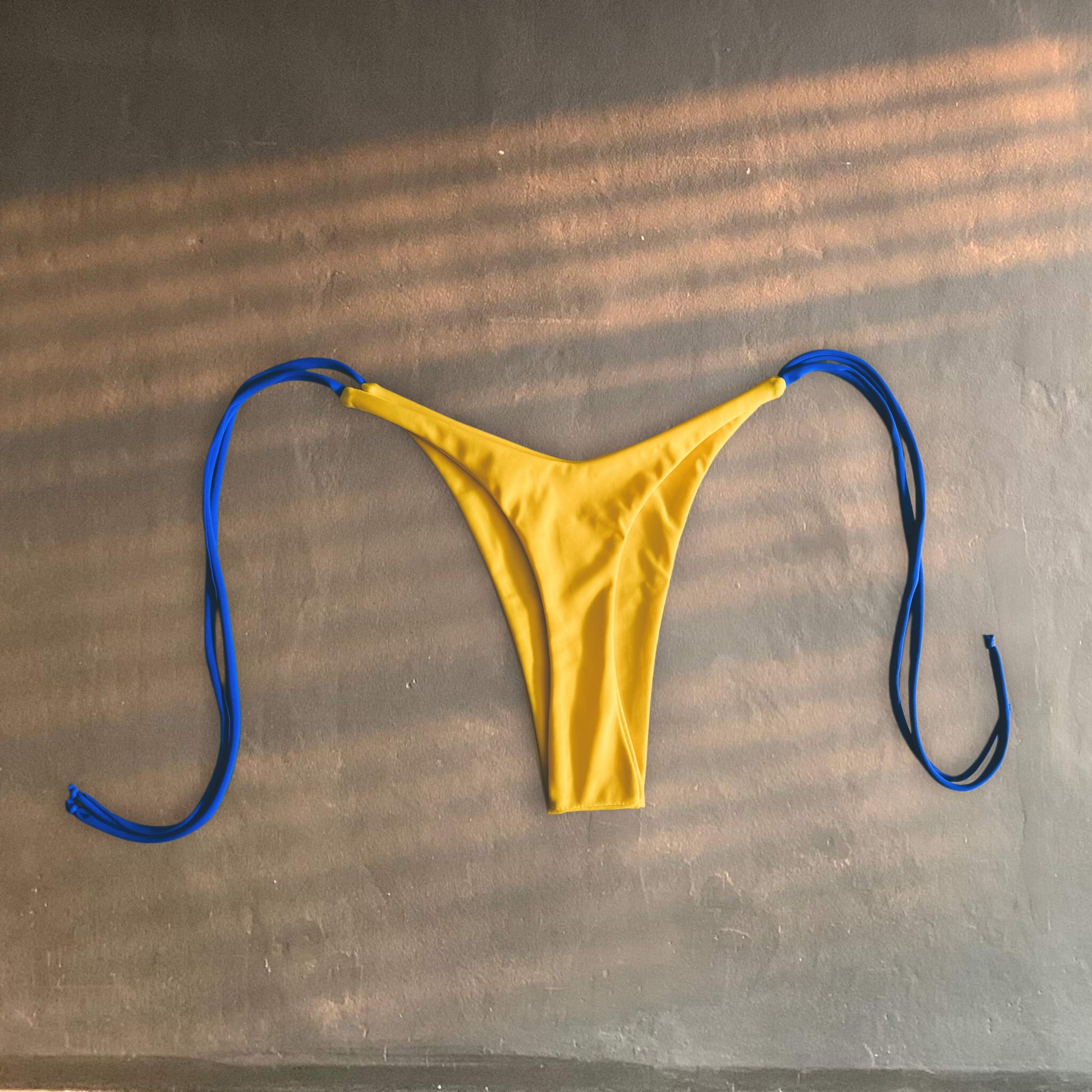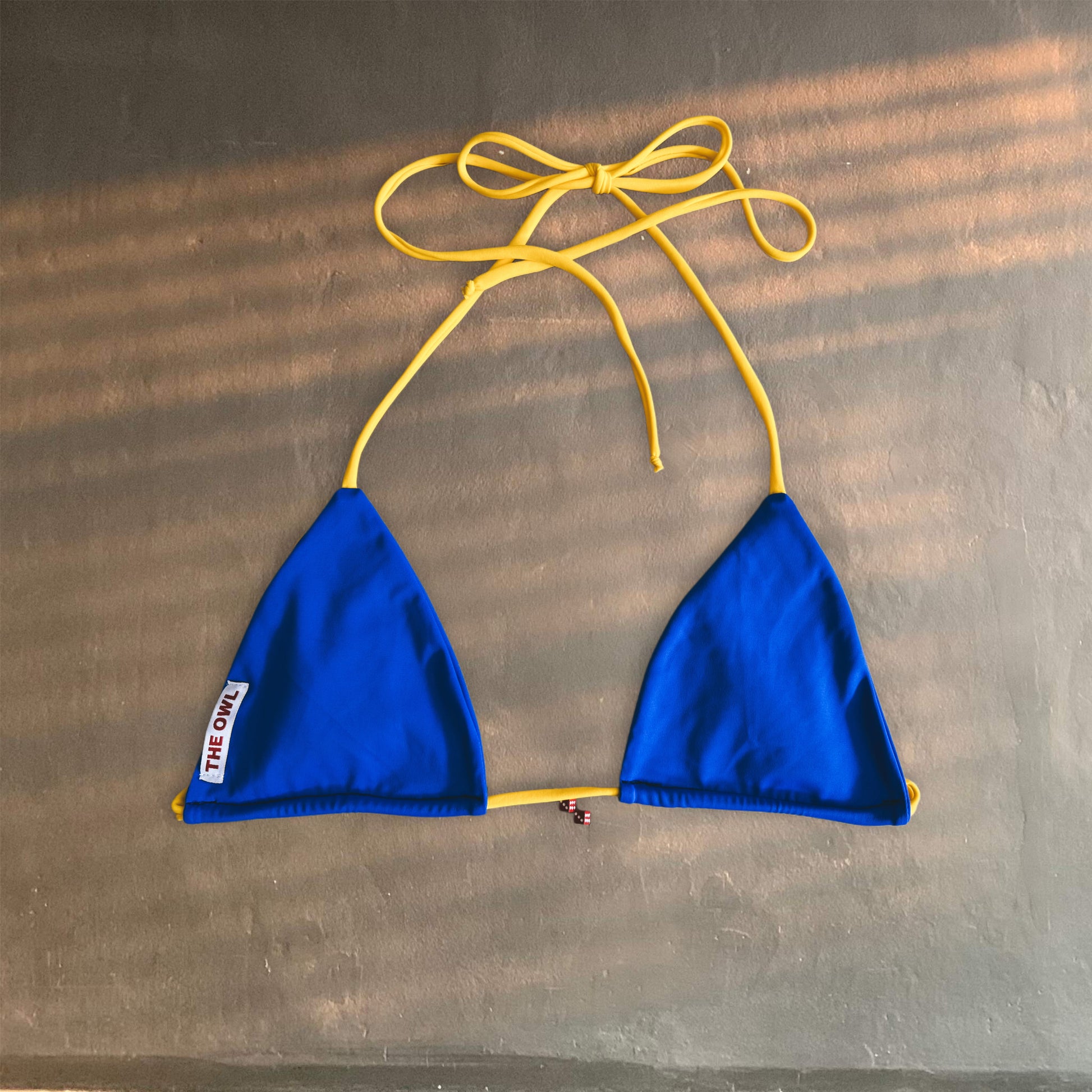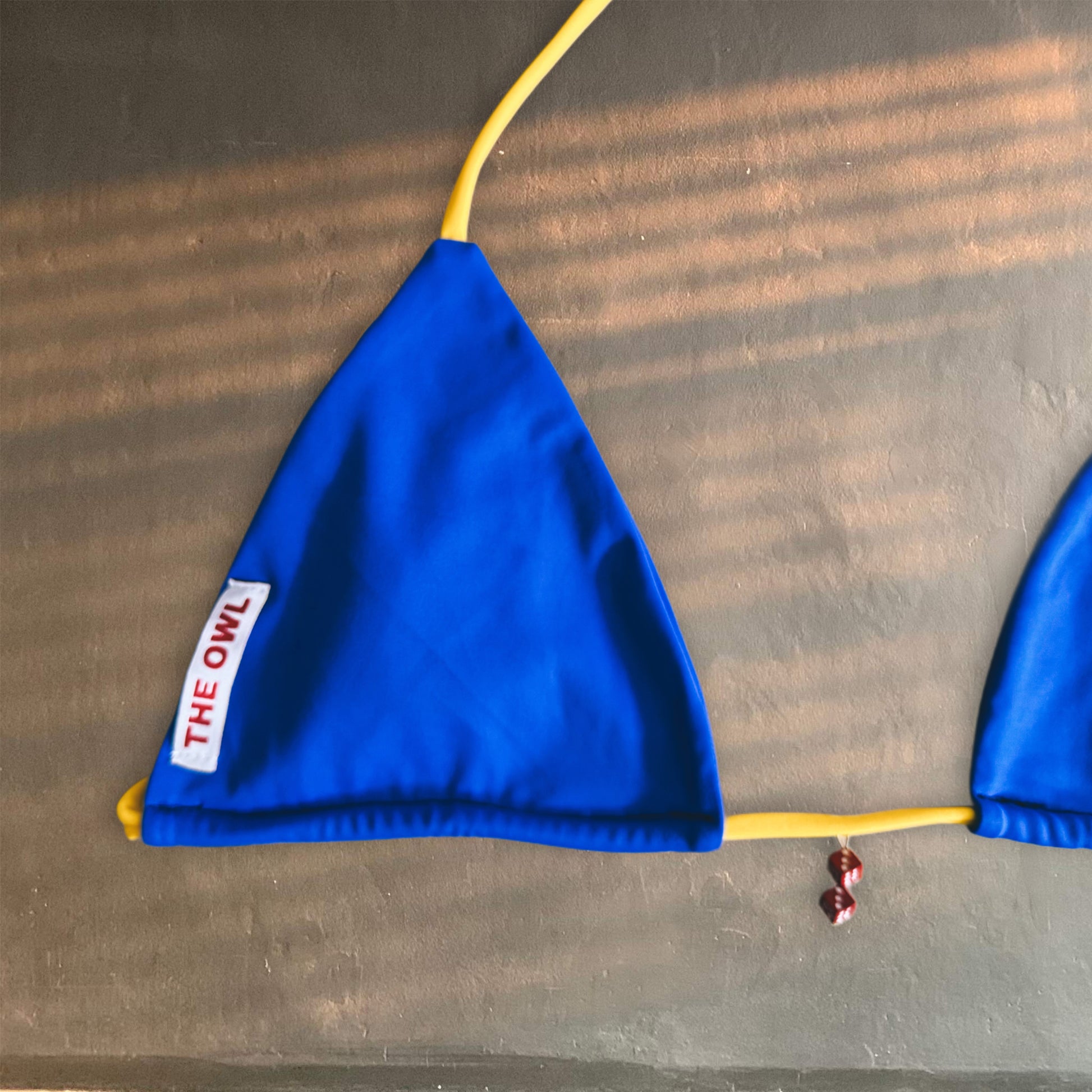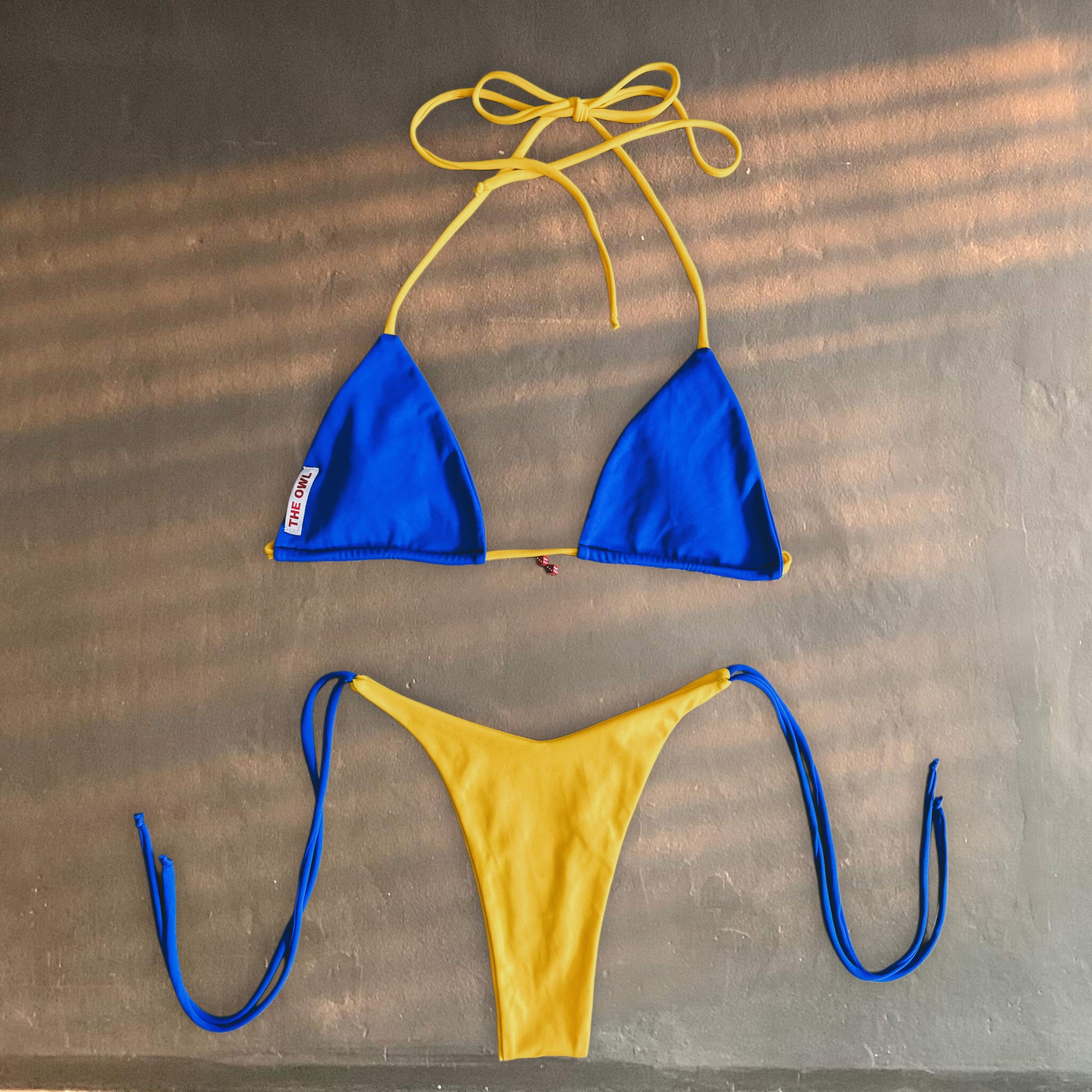 Dice Babe is a timeless bikini with a playful and refined twist. The blue triangle top with yellow straps features a delicate red dice charm, adding a unique touch of personality. The V-cut semi-thong bottom comes in a vibrant yellow with blue ties, creating a perfect balance of style and freshness. Designed for those who love to stand out with elegance and originality.