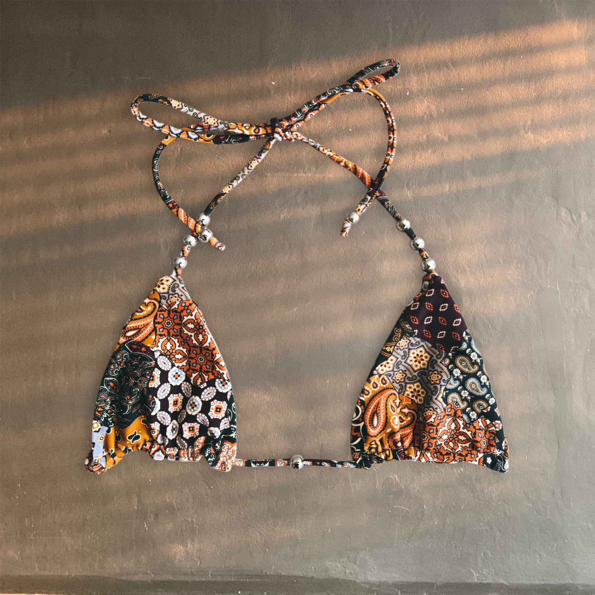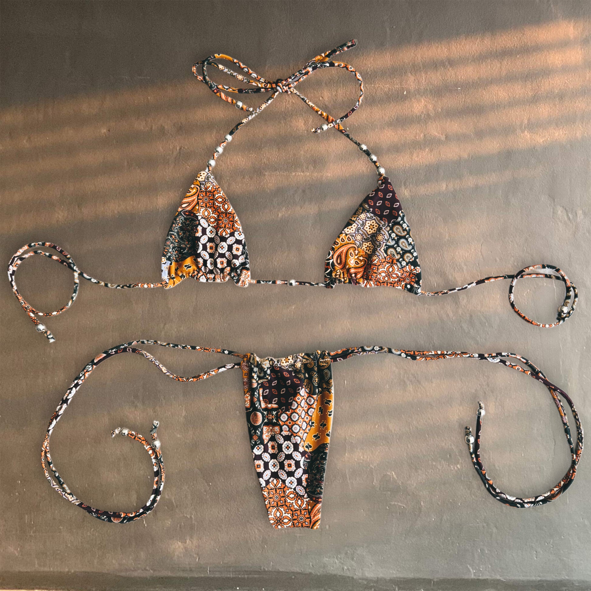 Step into effortless elegance with this boho-inspired bikini set. Featuring a classic triangle top, coordinating V-cut bottoms, and a matching choker with metallic charms, this look is perfect for those who crave individuality and refined detail.