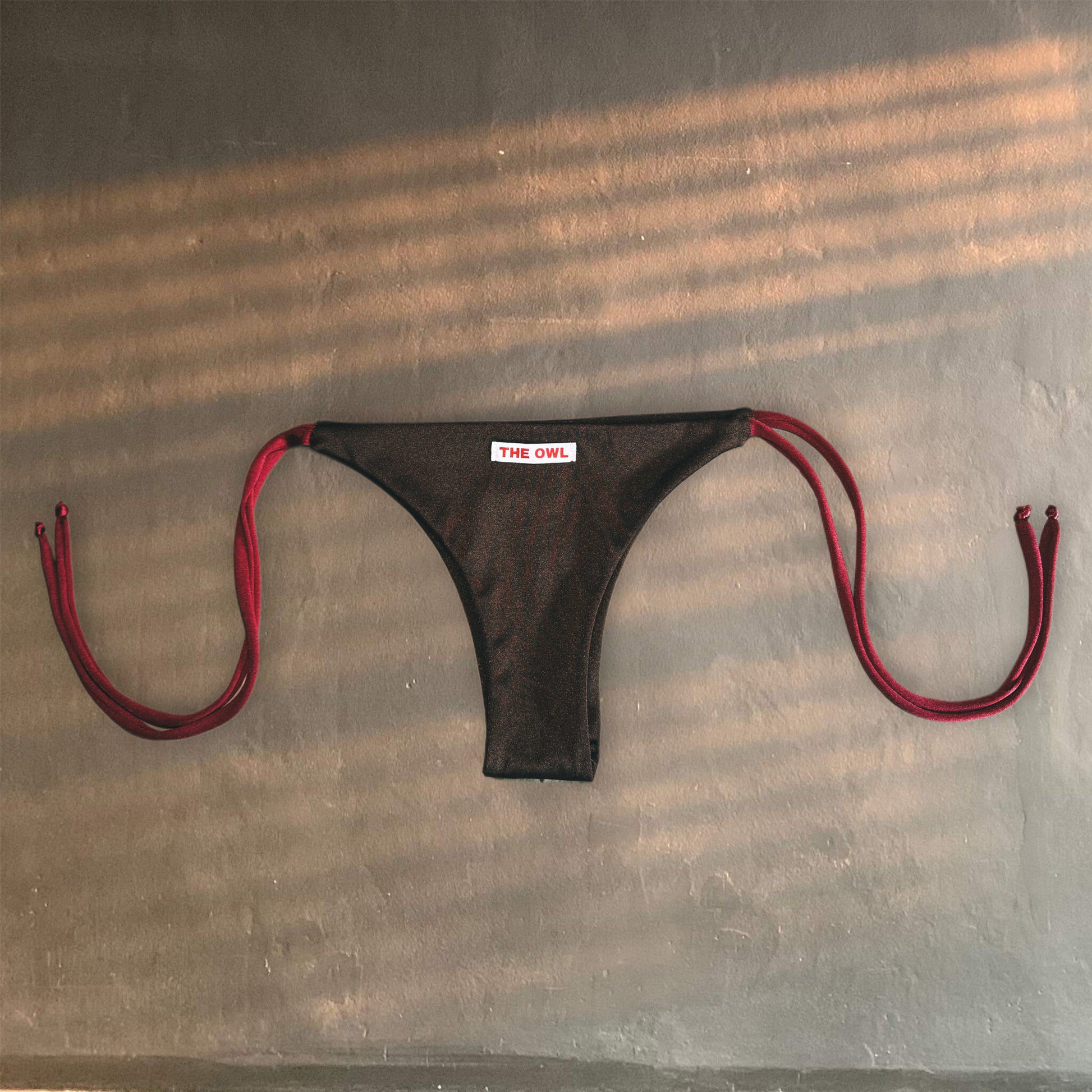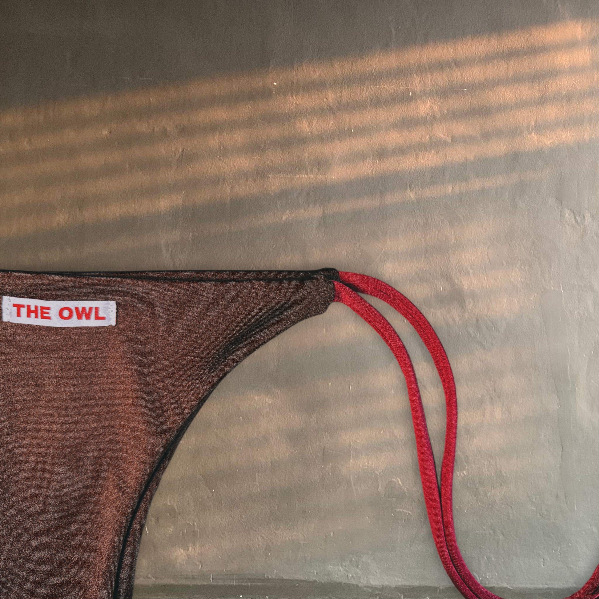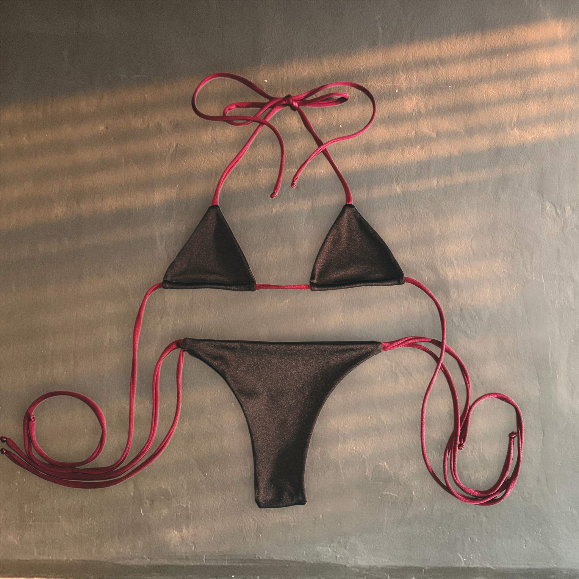 The Espresso Flame bikini blends the rich espresso tone with bold red ties, creating a piece that’s daring, sensual, and refined. The classic triangle top with extra-long adjustable straps offers endless styling possibilities.