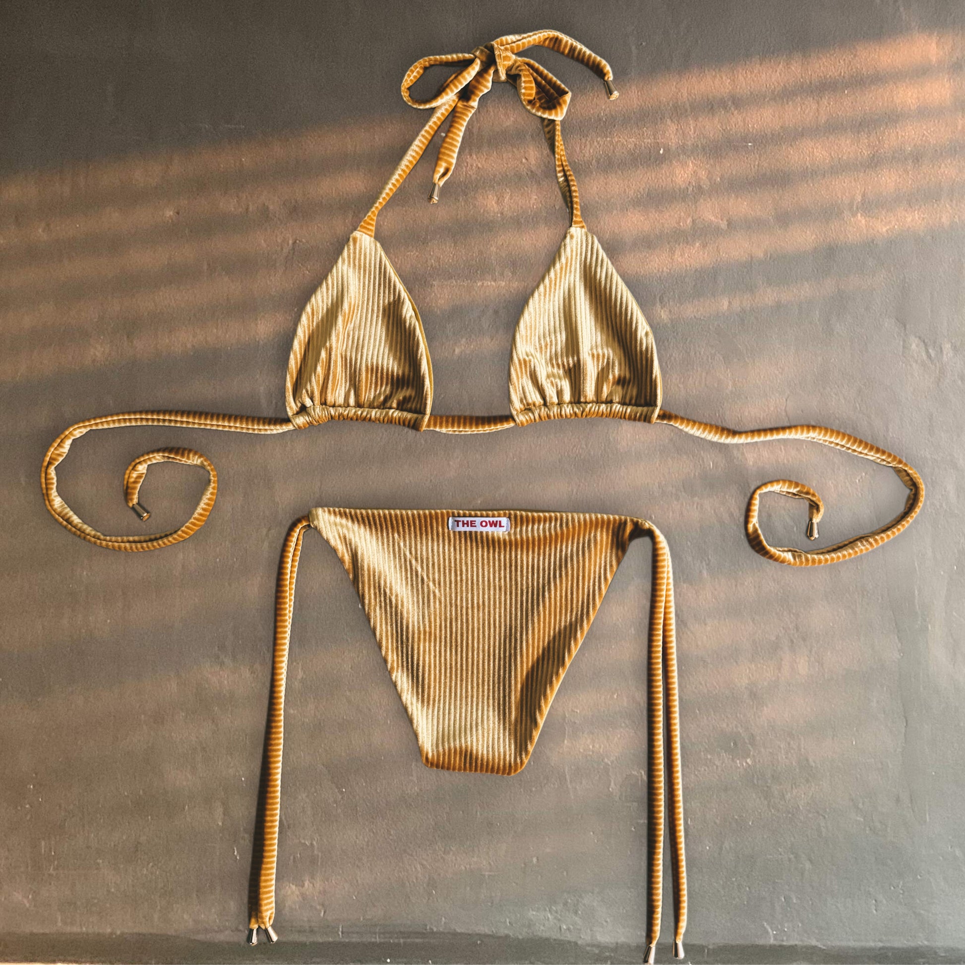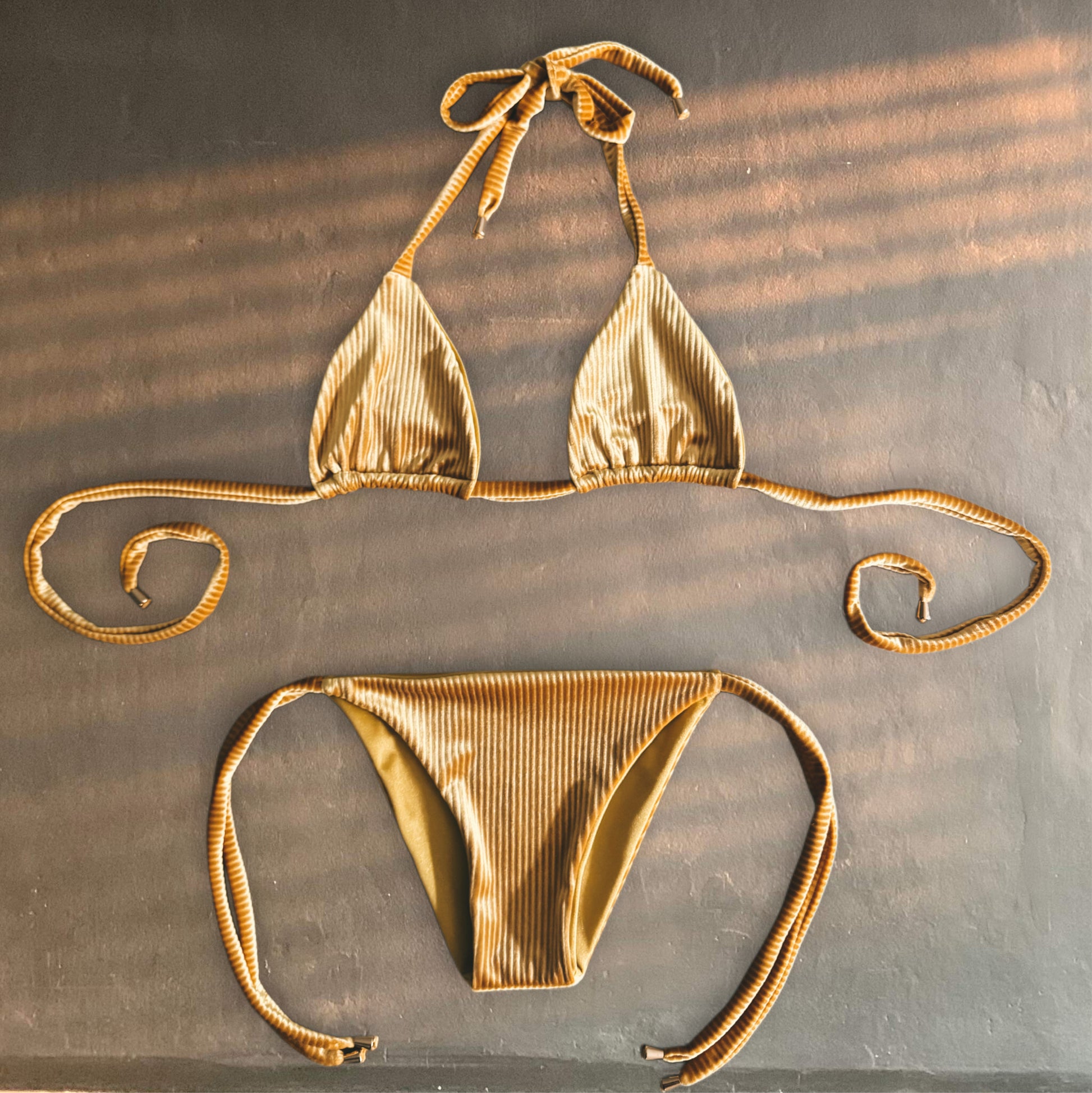 Feel the golden hour glow on your skin with our Sunset Velvet bikini. This classic triangle design features adjustable ties at the neck, back, and hips to perfectly shape your silhouette with a soft and modern twist. Made from ribbed velvet fabric, it’s smooth, stretchy, and undeniably chic.