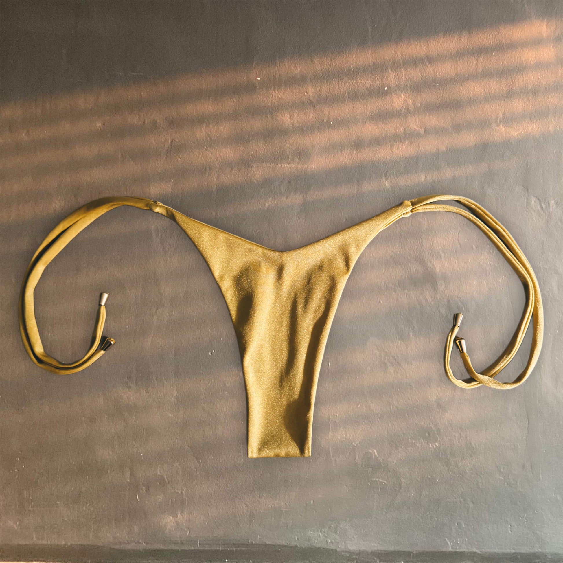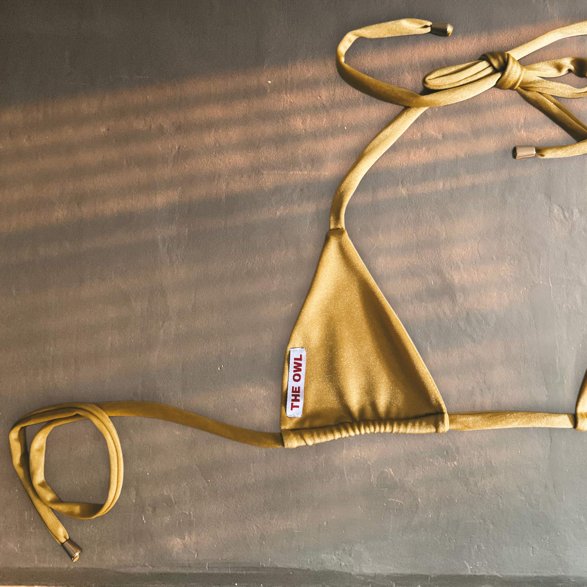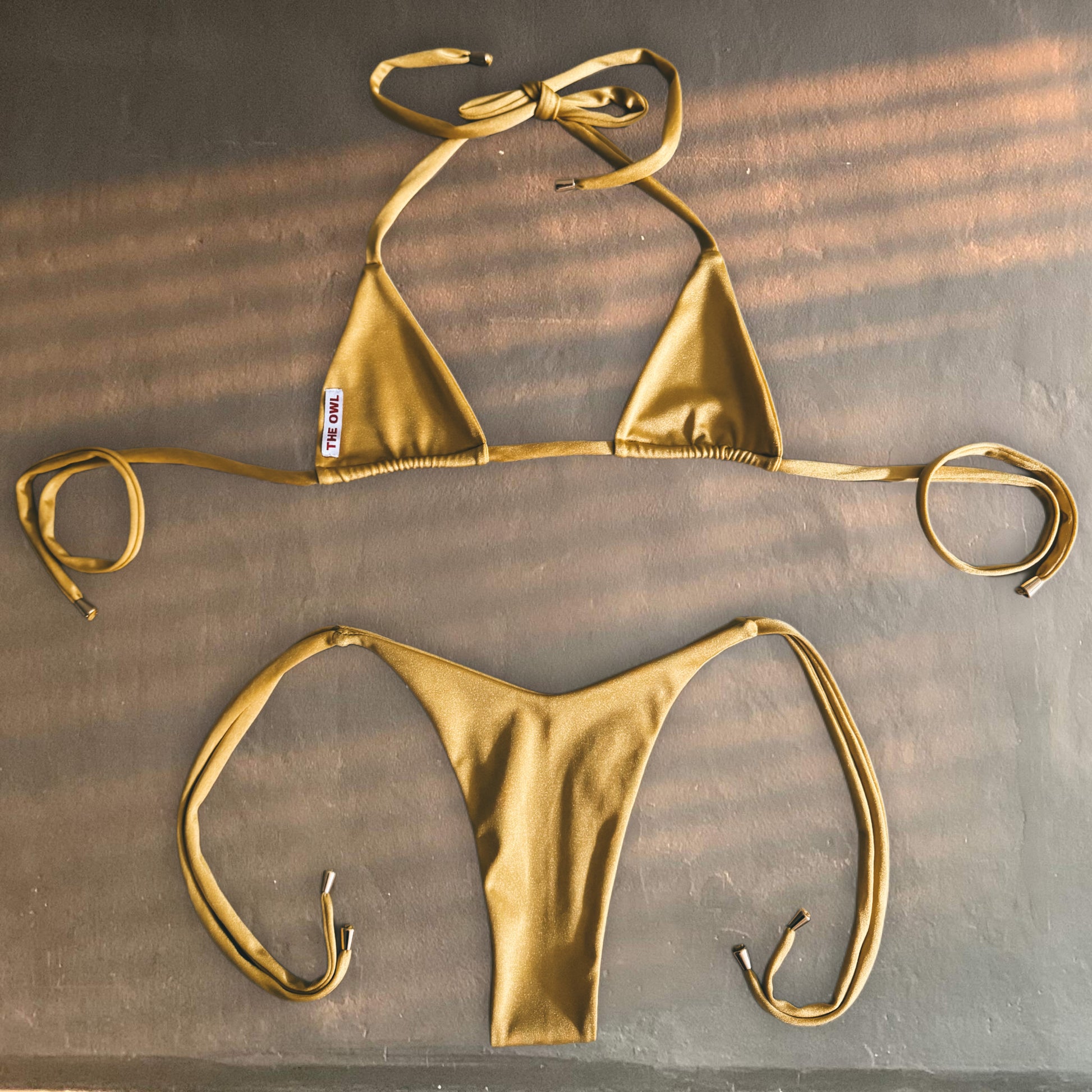 Shine with confidence in our Honey butter bikini – a timeless classic with a bold twist. Made from luxurious shiny stretch fabric, this piece hugs your body in all the right places and reflects the light with every move. Featuring a sleek triangle top and cheeky Brazilian bottom, this set is designed for the sun-loving, confident soul.