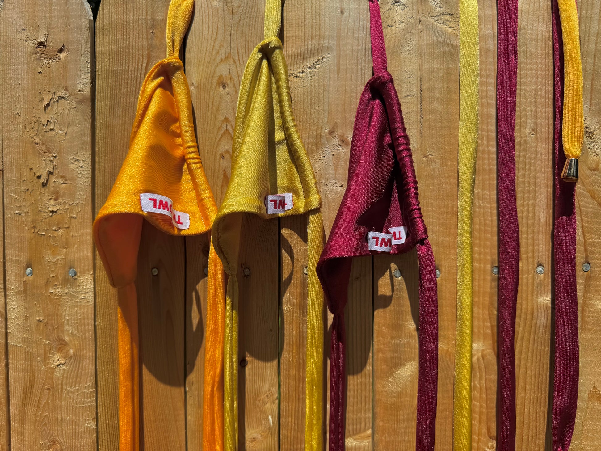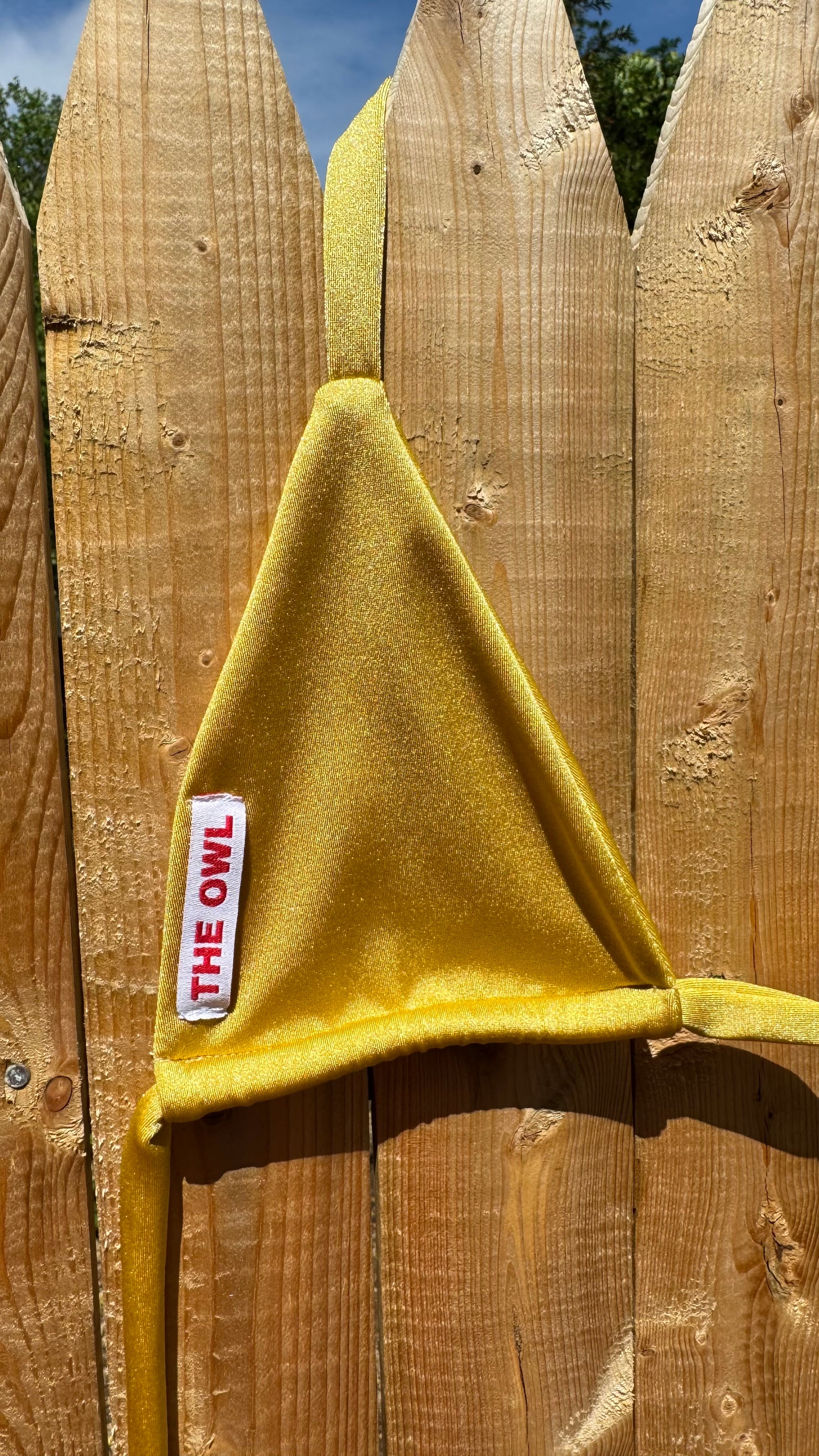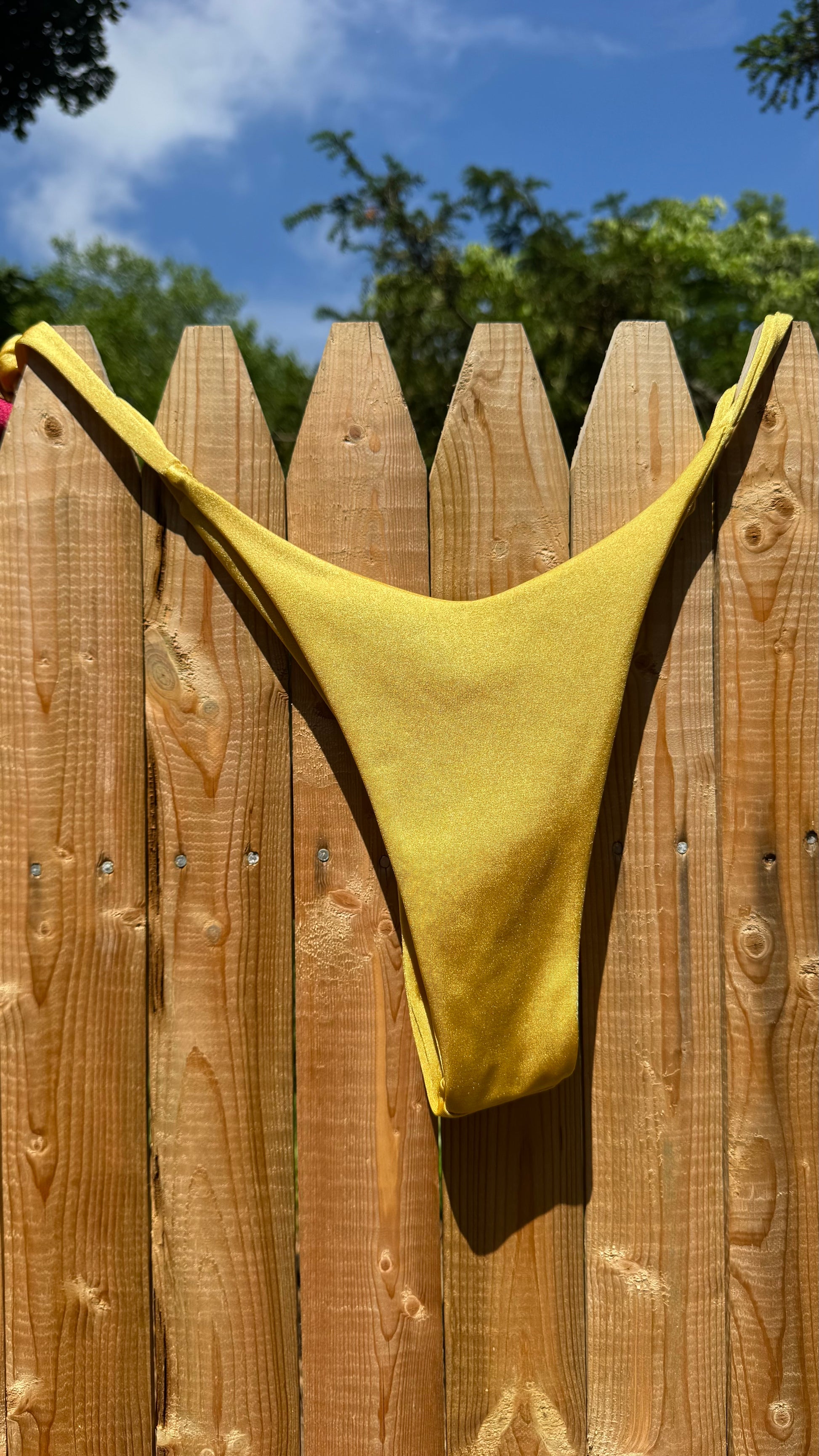 Shine with confidence in our Honey butter bikini – a timeless classic with a bold twist. Made from luxurious shiny stretch fabric, this piece hugs your body in all the right places and reflects the light with every move. Featuring a sleek triangle top and cheeky Brazilian bottom, this set is designed for the sun-loving, confident soul.